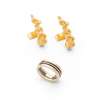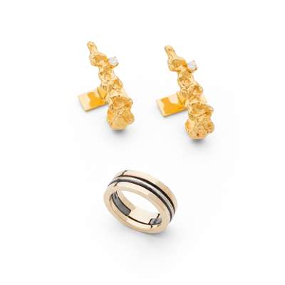 each of stylised textured form, claw set with a round brilliant-cut diamond, to secondary torpedo terminals, stamped 585; together with a two-tone ring, stamped 925 585