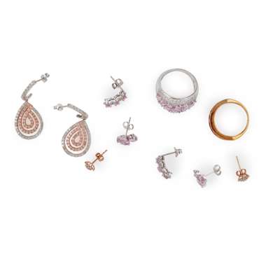to include a 9ct white gold diamond and pink sapphire dress ring, a 9ct yellow gold pink sapphire half eternity ring; a pair of 9ct white gold heart-shaped pink sapphire cluster earrings, a pair of diamond cluster earrings, stamped 9k; a pair of diamond pendent earrings, stamped 925 and a pair of pink sapphire earrings, stamped 925
