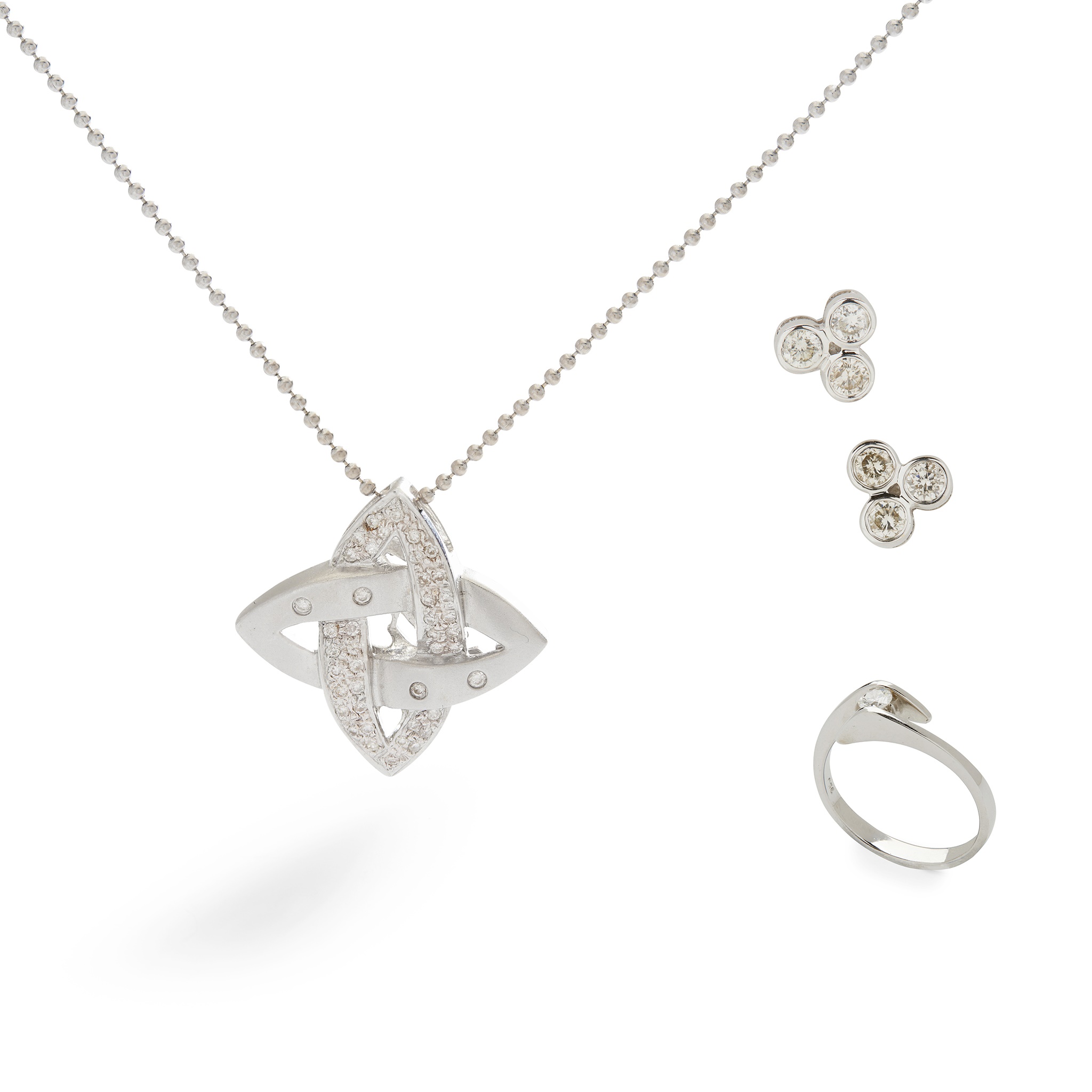 to include a single-stone diamond ring, stamped 750; a pair of 18ct gold round brilliant-cut diamond trefoil earrings, to post and butterfly fittings; and a diamond pendant necklace, stamped 18k