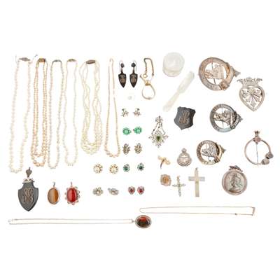 to include three hardstone and tigers-eye pendants, a single strand cultured pearl necklace; two cross pendants, a suite of Victorian jet mourning jewellery, various cultured and faux pearl necklaces, silver plaid brooches and costume jewellery