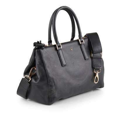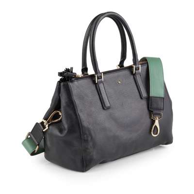 black leather, silver-tone hardware, with black and green shoulder straps, with outer dust/tote bag