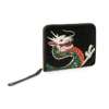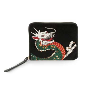 modelled in black velvet with embroidered dragon motif, the lined in red leather with zip and slip pockets, with dust bag