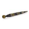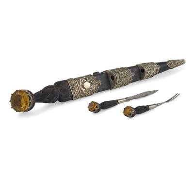 Stamped Lawrie of Glasgow to the plated mounts with thistle decoration, bi-knife and fork and pommel set foil backed pastes, saw back blade, short fuller, with belt strap