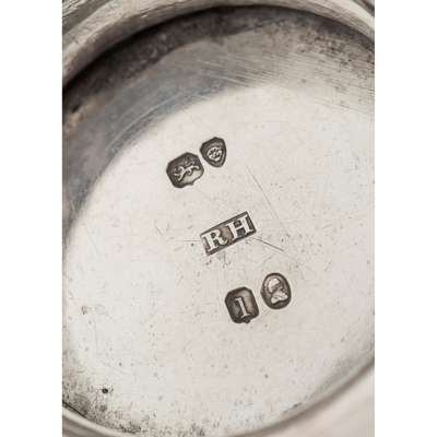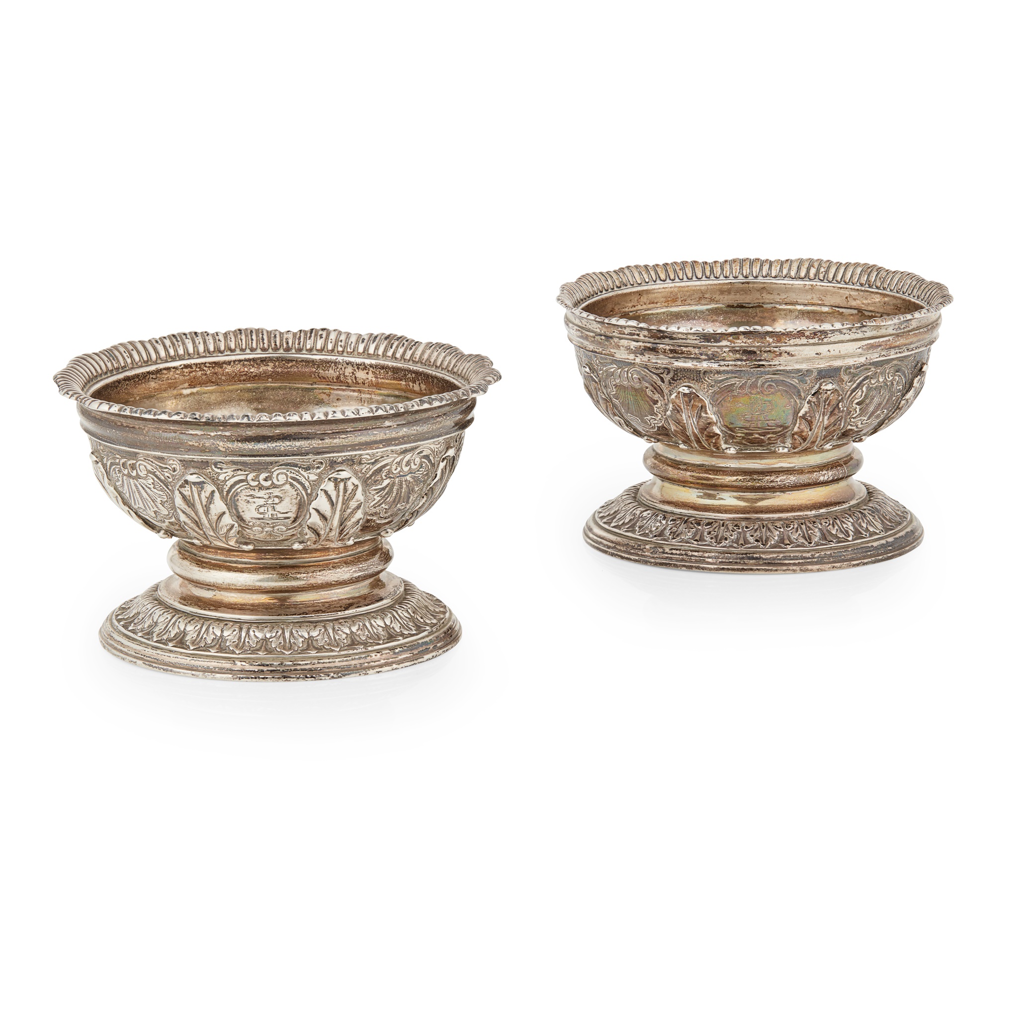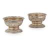 Robert Hennell II, London 1826, each of demi-spherical pedestal form, with undulating gadrooned border, engraved and applied foliate decoration to body with engraved crest, raised on a circular spreading foot with foliate border