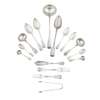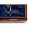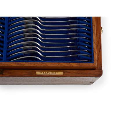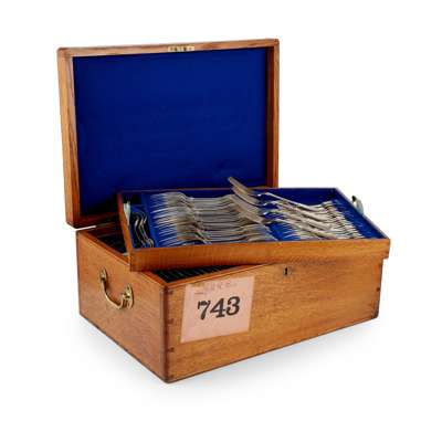 predominantly London, various makers and marks, including John, Henry, and Charlies Lias and Mary Chawner etc, comprising, a basting spoon, a soup ladle, thirty five dinner forks, thirty five dessert forks, fifteen tablespoons, twenty nine dessert spoons, thirty seven teaspoons, ten egg spoons, two mustard spoons, seven salt spoons, sauce ladles, asparagus tongs and butterknives, all contained in an oak fitted canteen retailed by D & J Welby Ltd.