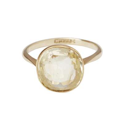 millegrain set with a cushion cut yellow sapphire, to a plain yellow metal shank stamped 9ct