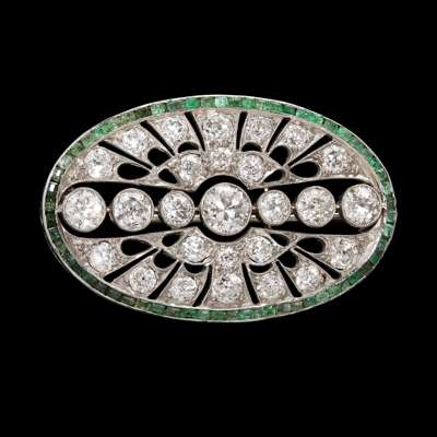 of oval outline, millegrain set with a central row of seven graduated old round cut diamonds, in a pierced surround set with smaller graduated old round cut diamonds and a channel set border of square cut emeralds, unmarked