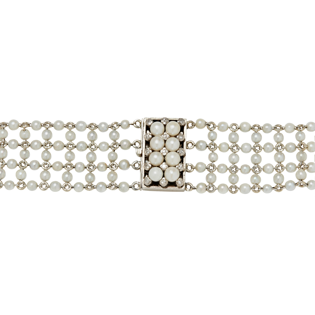 composed of seven rows of alternating cultured pearls, the white metal clasp set with alternating rows of cultured pearls and small eight cut diamonds