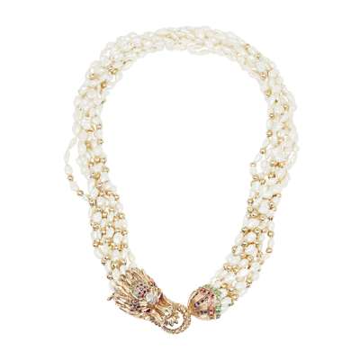 composed of eight strands of baroque pearls with yellow metal bead spacers, to a dragons head feature clasp, set throughout with small round cut rubies, sapphires, emerald and diamonds, the eyes collet set with two pear shaped rubies, stamped 14k