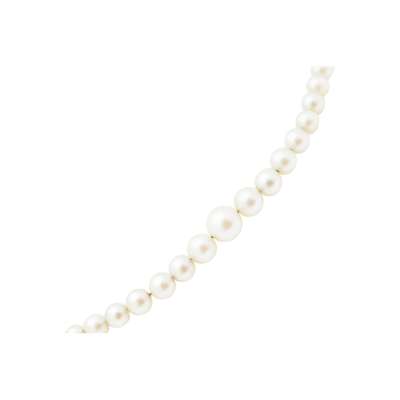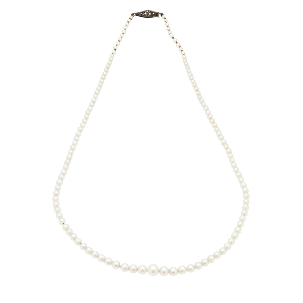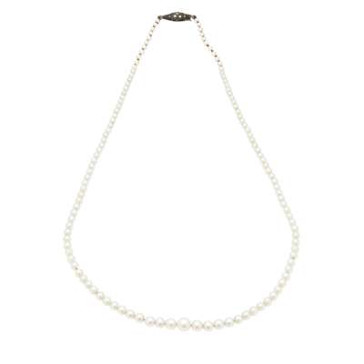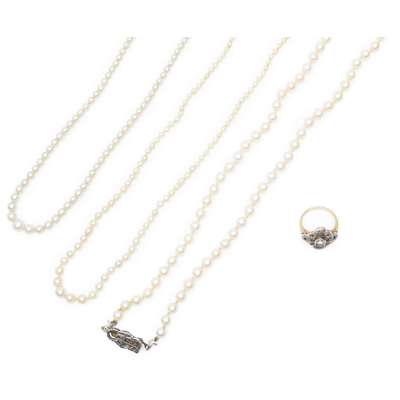 to include a single strand cultured pearl necklace with marcasite set clasp; a single strand cultured pearl necklace with floral sapphire set clasp; an untested pearl necklace, the clasp set with diamond chips; a cluster ring collet with a round cut paste, in a scrolling border of set with emeralds and diamond chips (4)