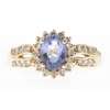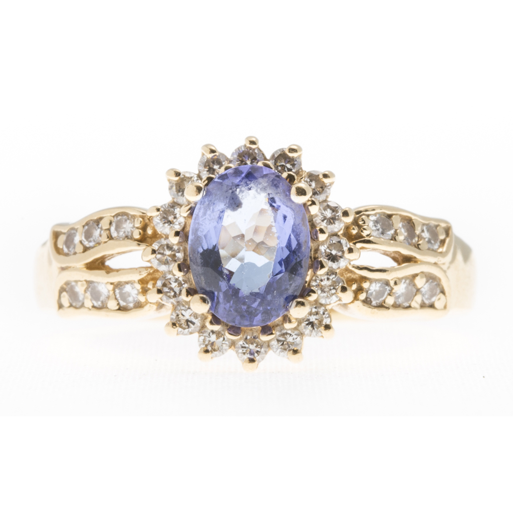 claw set with an oval cut Tanzanite, in a single border of small round brilliant cut diamonds, each split shoulder set with six graduated small round brilliant cut diamonds, to a plain shank stamped 14k