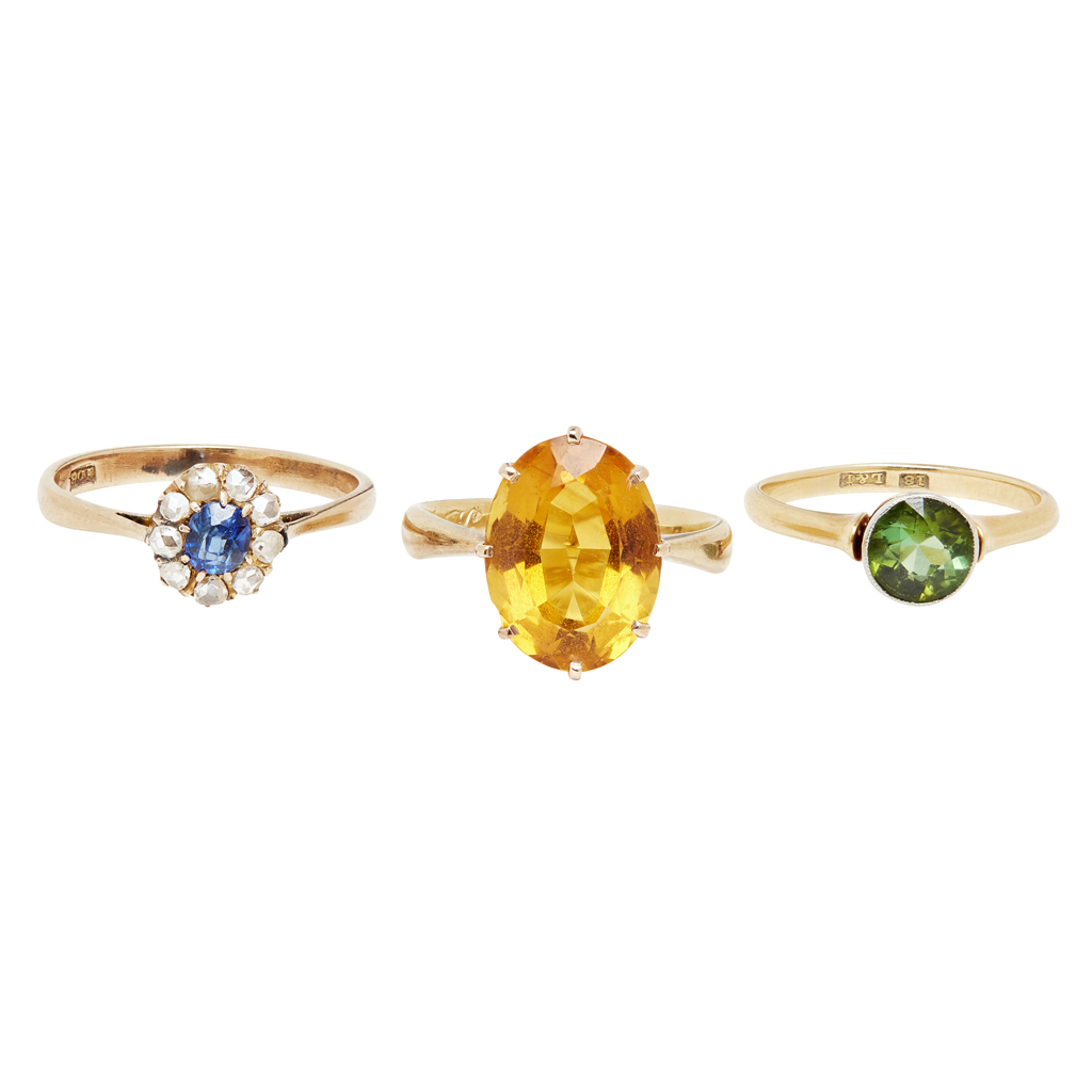 to include a sapphire and rose cut diamond set cluster ring, stamped 9ct; an 18ct gold citrine set dress ring, and a green tourmaline set ring, stamped 18 (3)