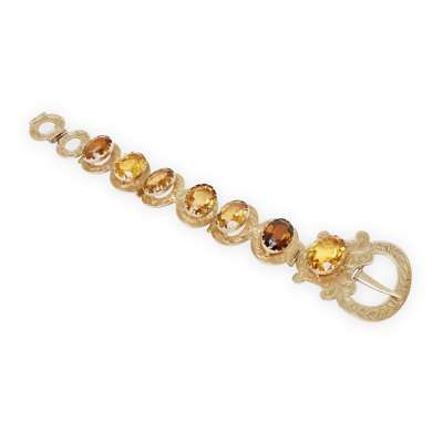 modelled as a belt, comprising of graduated oval links, claw set with seven oval cut citrines, modelled in engraved gilt metal marked B & C, with Victorian diamond registration mark