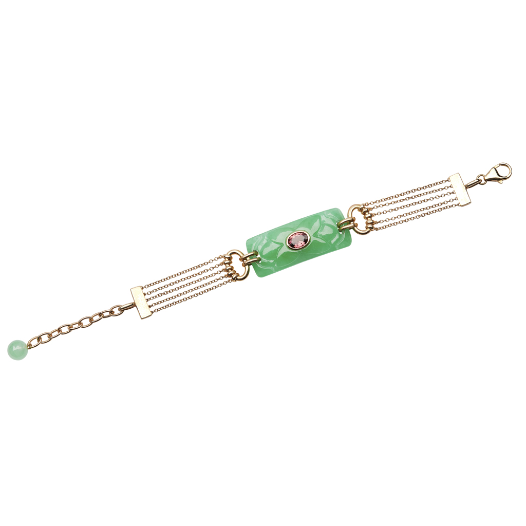 the curved rectangular jade panel with engraved decoration and collet set pink tourmaline, to a five strand curb link bracelet, stamped 14k, with additional jade bead detail to clasp