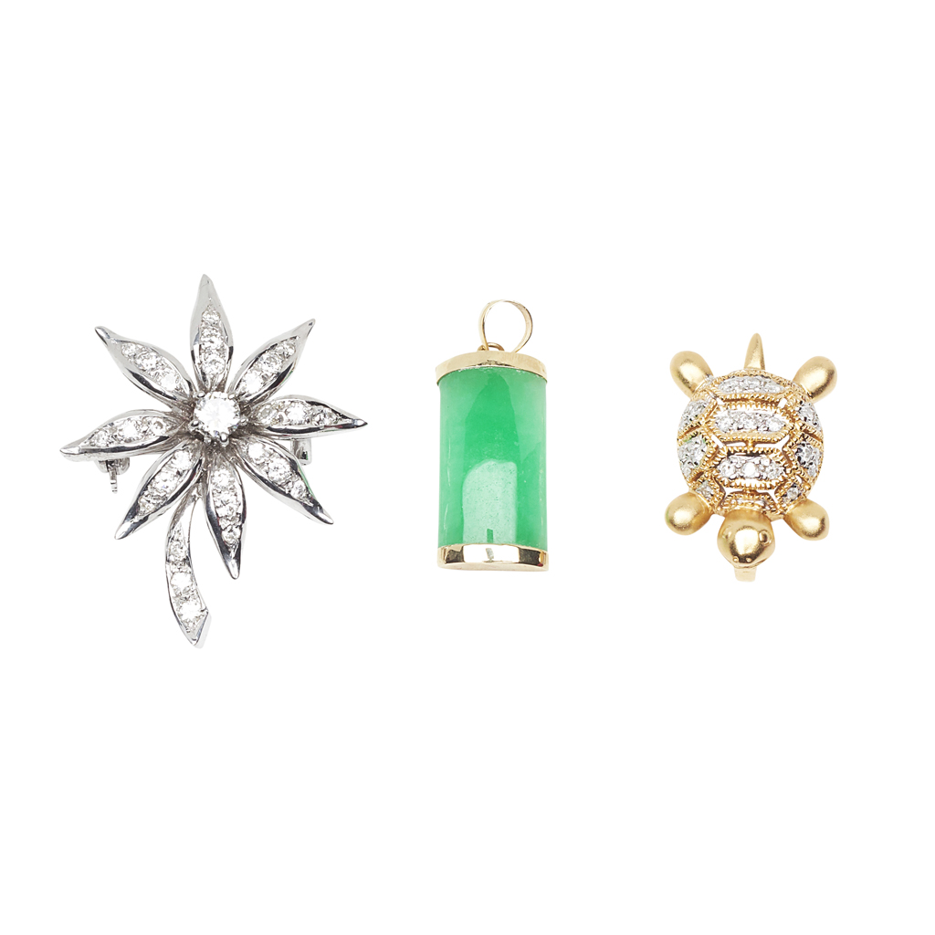 to include a floral 18ct white gold diamond set brooch; a turtle pendant, set with small round brilliant cut diamonds, stamped 18ct; a jade set pendant (3)