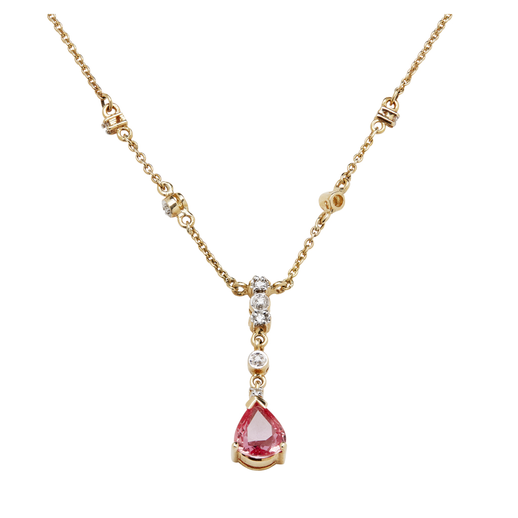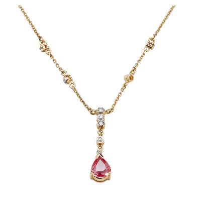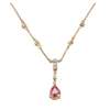 claw set with a pear shaped pink tourmaline, suspended from small eight cut diamond set links, the integral chain also with diamond set links, stamped 750