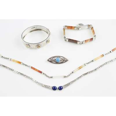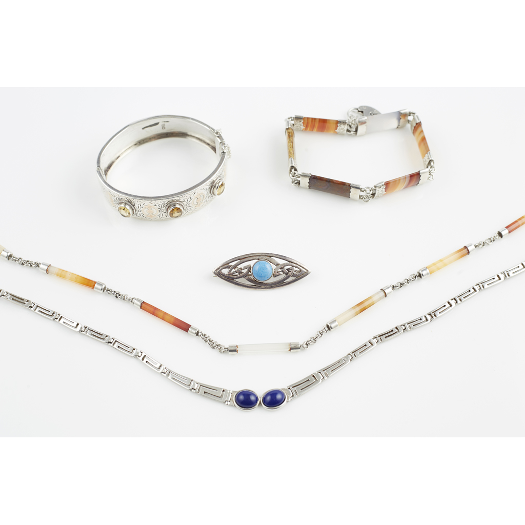 to include a necklace set with banded agate batons, stamped 925, an agate set bracelet in white metal, a silver and citrine set bangle; together with a Greek key style necklace, collet set with lapis lazuli cabochons and a turquoise Celtic brooch (5)