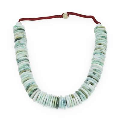composed of circular jade discs to a woven chain, jade bead spacers to fasten