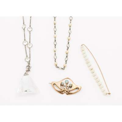 the first modelled as a spider in its web, the body set with a small round cut zircon and ruby, stamped 9ct to reverse; the second modelled as a swallow in 9ct gold, set with seed pearls; together with a bar brooch bearing the enamelled crest and motto of the Royal Army Medical Corps together with a collection of jewellery, to include an Art Nouveau brooch set with small opals, stamped 9Kt; an opal bead bar brooch, a long seed pearl and paste set neck chain; another with facetted pendant (7)