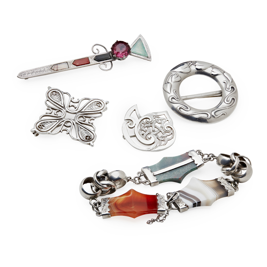 to include three Ola Gorrie brooches, each of pierced Celtic design; a Scottish agate set bracelet and a Scottish agate and paste set kilt pit, a bar brooch with onset agate and pearl St Andrews cross, an agate set basket hilted sword brooch, two further agate set brooches modelled as an anchor and a dirk (qty)
