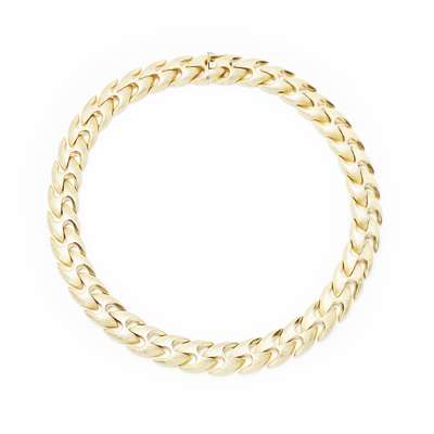 composed of a single row of curved links with a textured finish, concealed clasp and safety clip