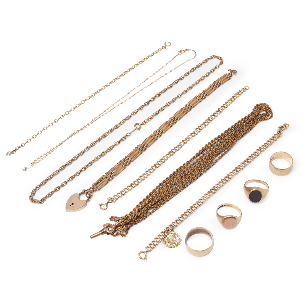 to include two gentleman's signet rings, one with onyx matrix; two wedding bands, and a belcher link chain; together with a rolled gold gate link bracelet and various other yellow metal chains (qty)