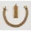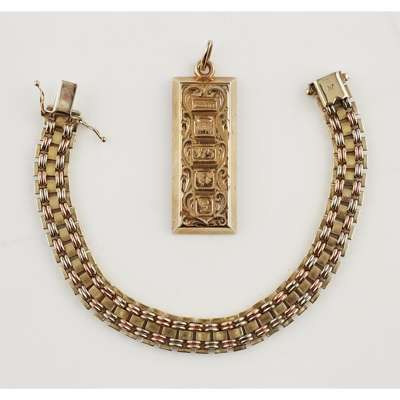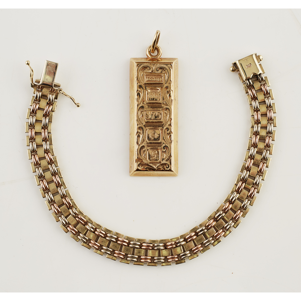 to include a 9ct gold rectangular pendant with feature hallmarks, and a 9ct tri-coloured gold fancy link bracelet (2)