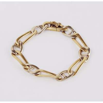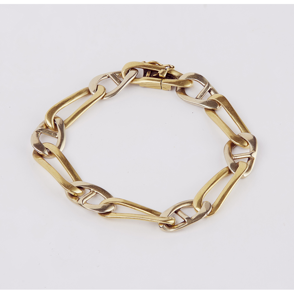 composed of flattened stylised curb links, to a concealed clasp and safety clip, stamped 750