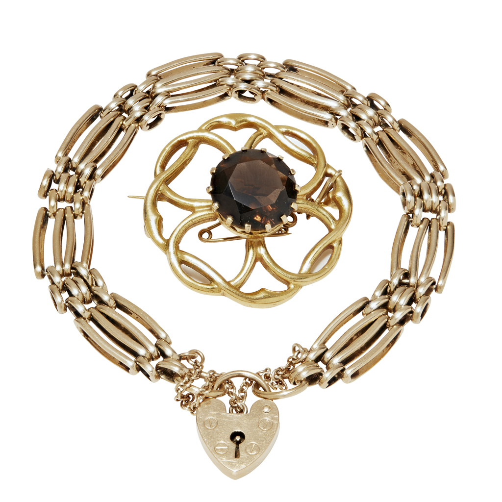 of traditional form with padlock clasp and safety chain; together with a 9ct gold smokey quartz set brooch (2)