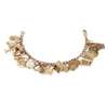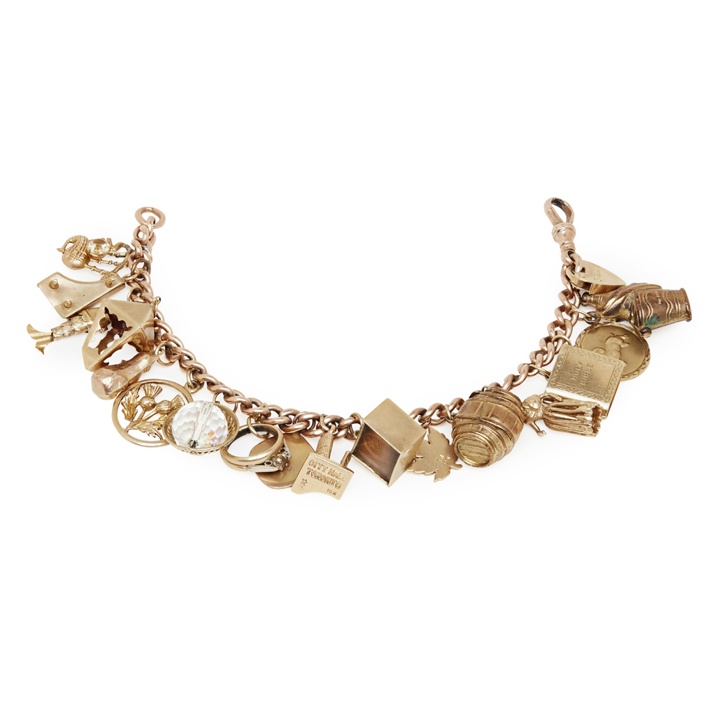 composed of curb links with a padlock clasp, suspending various charms including an articulated fish, a barrel, a piano and a champagne bucket etc