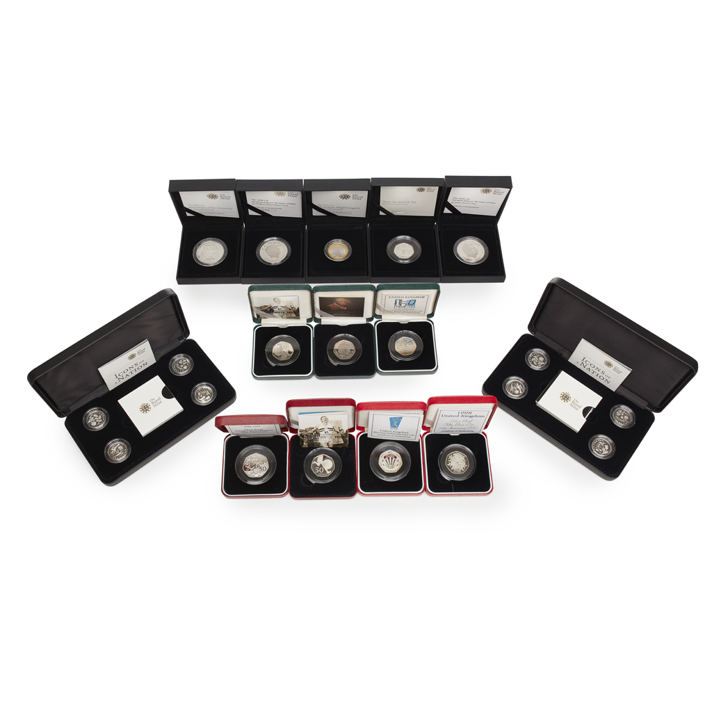 2013, cased set silver proof £1 coins, Icons of a Nation; 2008, two coins, a Piedfort and a silver proof £5 coin 60th birthday HRH Prince of Wales; 2016, silver proof £5 coin, Restoration of Monarchy; 2016, cased silver Piedfort proof 50np coin, Believe in Extraordinary; 2004, silver and Piedfort proof 50np coins, 60th anniversary four minute mile; 1998, silver Piedfort proof 50np, NHS anniversary; 2010, proof silver £2 coin, Florence Nightingale; 2005, proof silver Piedfort 50np coin, Samuel Johnson; 1998, silver proof 50np coin 25th anniversary EEC; 2000, proof silver 50np, 150th anniversary Public Libraries; 1994, silver proof 50np coin, D-Day commemoration (14)