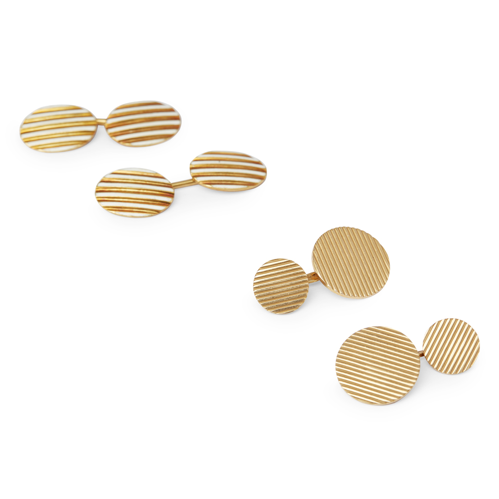 to include a pair with white striped enamel detail to oval terminals, unmarked; a pair with ribbed detail to circular terminals, stamped 750 (2)