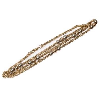 composed of woven links, set at intervals with three ball links, to a lobster-type clasp, stamped 750