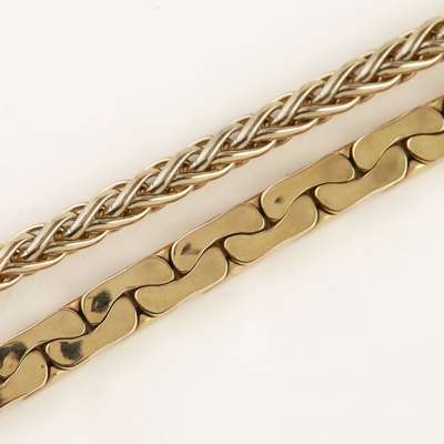 composed of flattened interlocking rectangular links; together with a 9ct gold palma link necklace (2)
