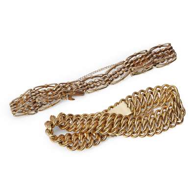 the first composed of twisted oval links, concealed clasp and safety chain, apparently unmarked; together with another apparently unmarked, square links (2)