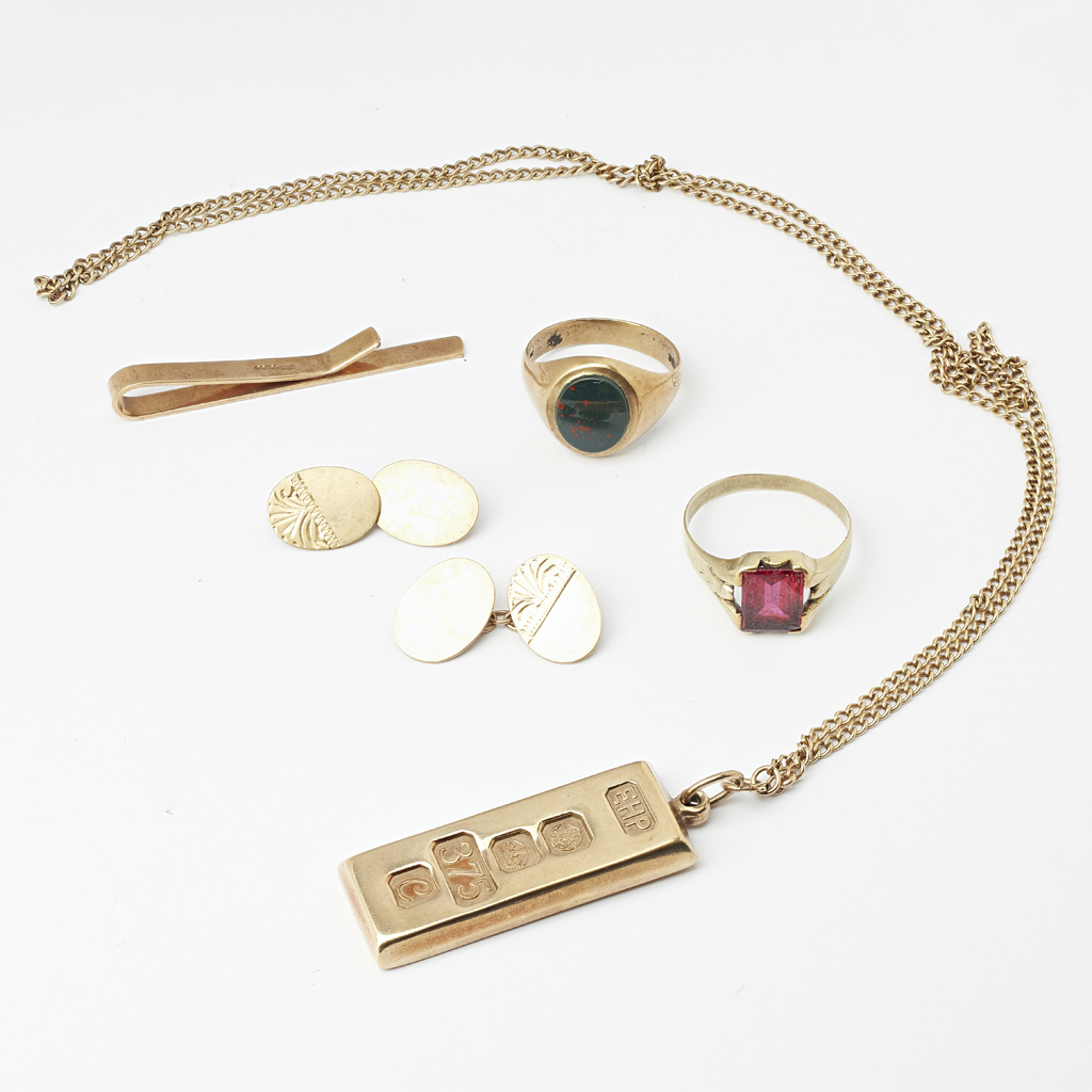 to include a 9ct gold feature hallmark pendant, a pair of 9ct gold cufflinks; a 9ct gold tie clip, a 9ct gold agate set signet ring; together with a curb link chain stamped 9ct and yellow metal and synthetic ruby set ring (6)