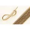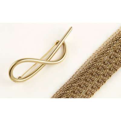 to include a yellow metal brooch, of scrolling design, unmarked; a fancy stylised curb link chain, stamped 575; two further yellow metal neck chains (4)
