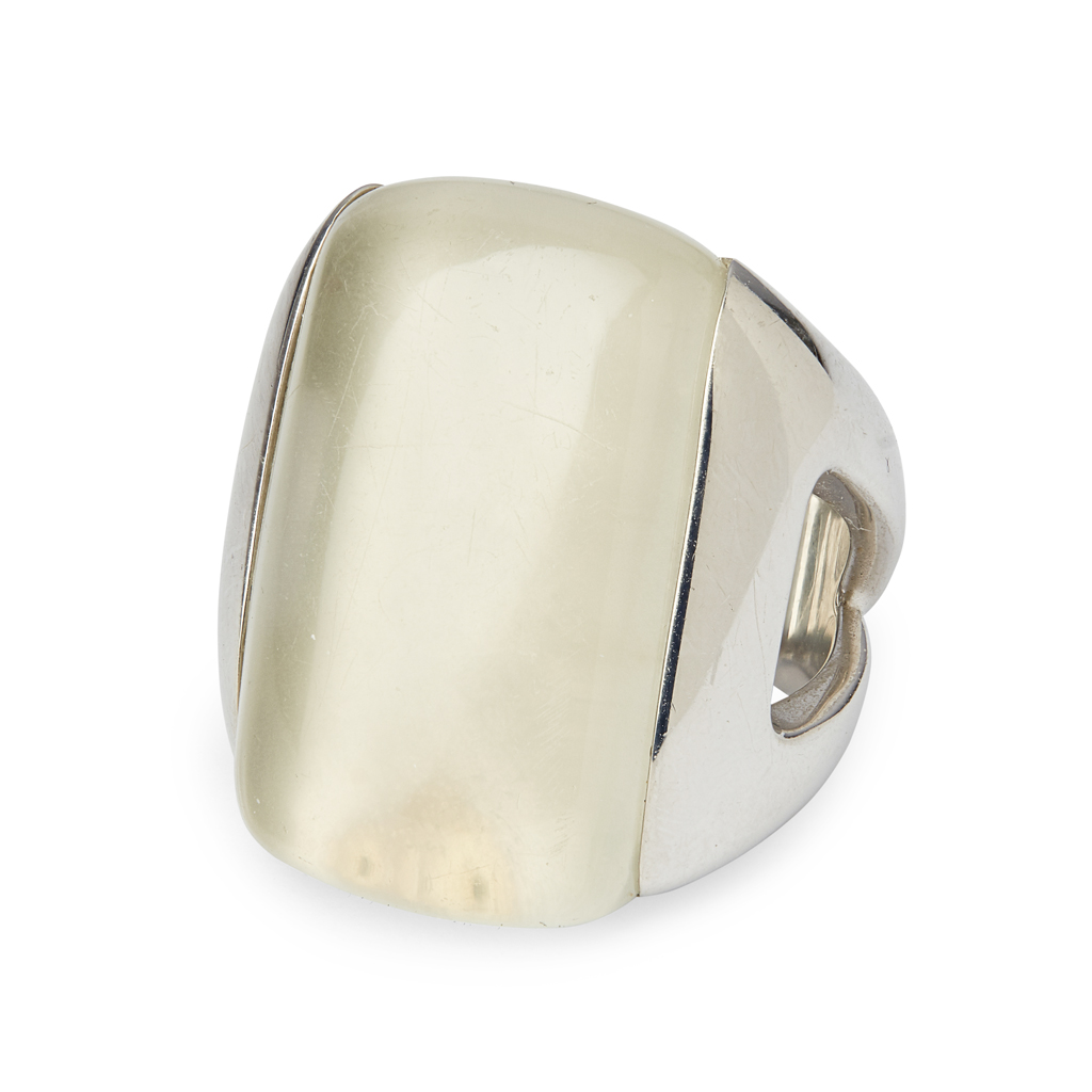 channel set with a large oblong white gem, to a white metal shank stamped 750, Gavello