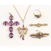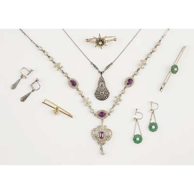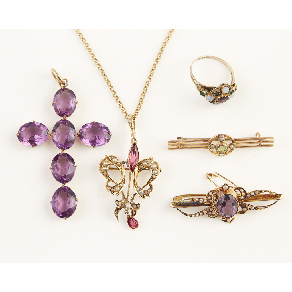 to include a 9ct gold amethyst and seed pearl set brooch, a peridot and see pearl set bar brooch; an 18ct gold opal and diamond set brooch, a tourmaline and seed pearl set pendant necklace, various other pieces of costume jewellery (qty)