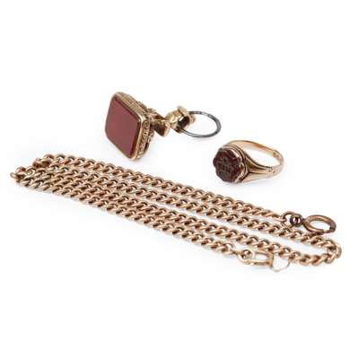 the hardstone terminal with engraved initials, together with a hardstone set fob seal, unmarked, a curb link chain, unmarked (3)