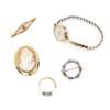to include a circular sapphire and seed pearl set brooch, unmarked; a three stone diamond ring, shank indistinctly marked; a cameo brooch, stamped 10k; a yellow metal Victorian garnet set brooch; a lady's H&G wrist watch (5)