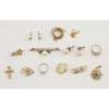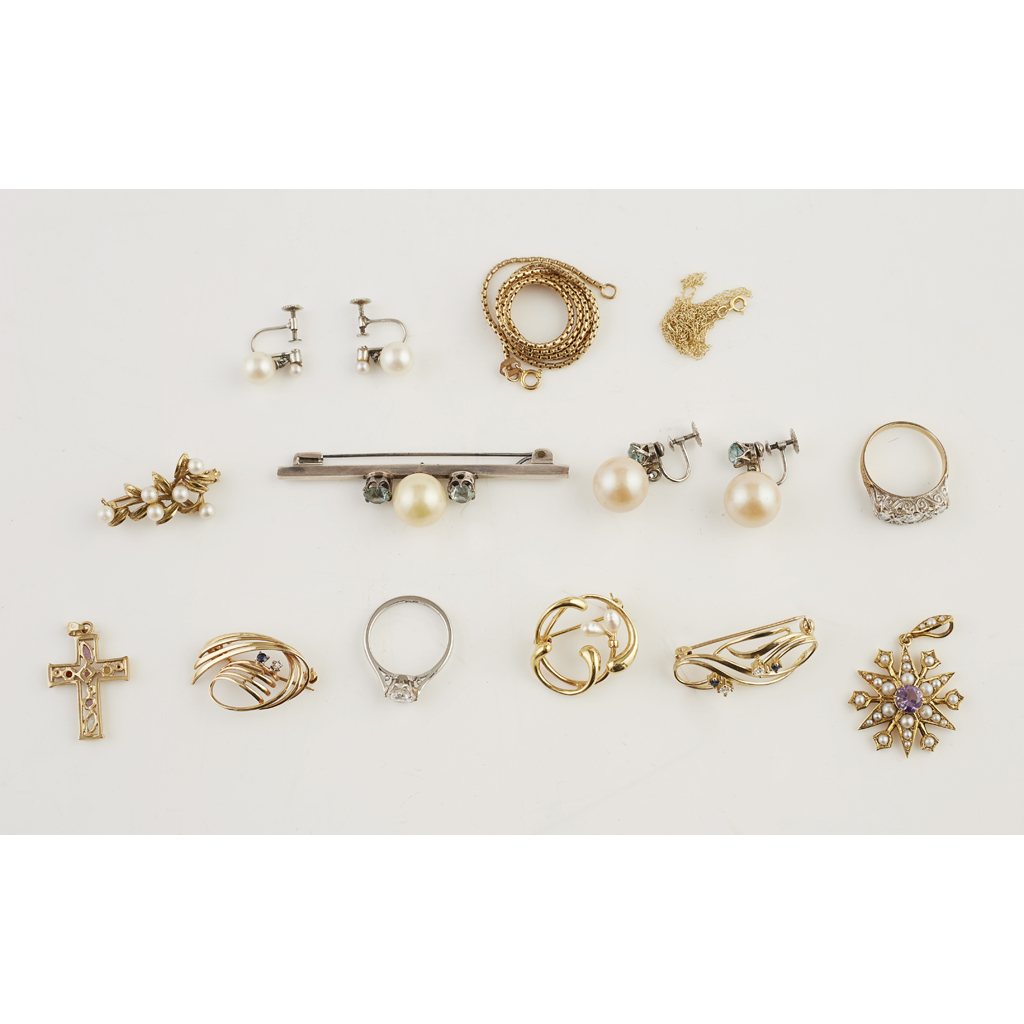 to include a pair of cultured pearl and zircon set earrings with accompanying brooch, a seed pearl and amethyst star pendant, to a 9ct gold fancy link chain, a 9ct multi-gem set cross pendant, to a trace link chain stamped 375; together with two pearl brooches of scrolling design stamped 9kt and 375, a pair of cultured pearl earrings, to a white metal stamped 9ct; two sapphire and diamond set brooches stamped 375 and 9ct and two imitation diamond set rings (qty)