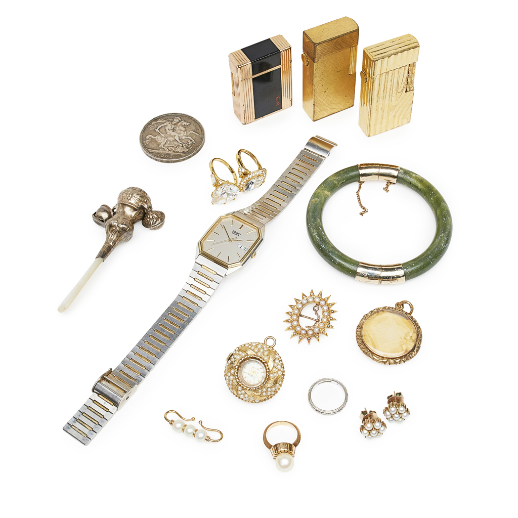 to include a green hardstone set bangle, a seed pearl set brooch; various cultured pearl set pieces, two faux-diamond set cocktail rings; a platinum wedding band, a gentleman's Seiko wrist watch, a 1902 crown; three gilt metal lighters, a Victorian children's rattle, a yellow metal portrait locket (qty)