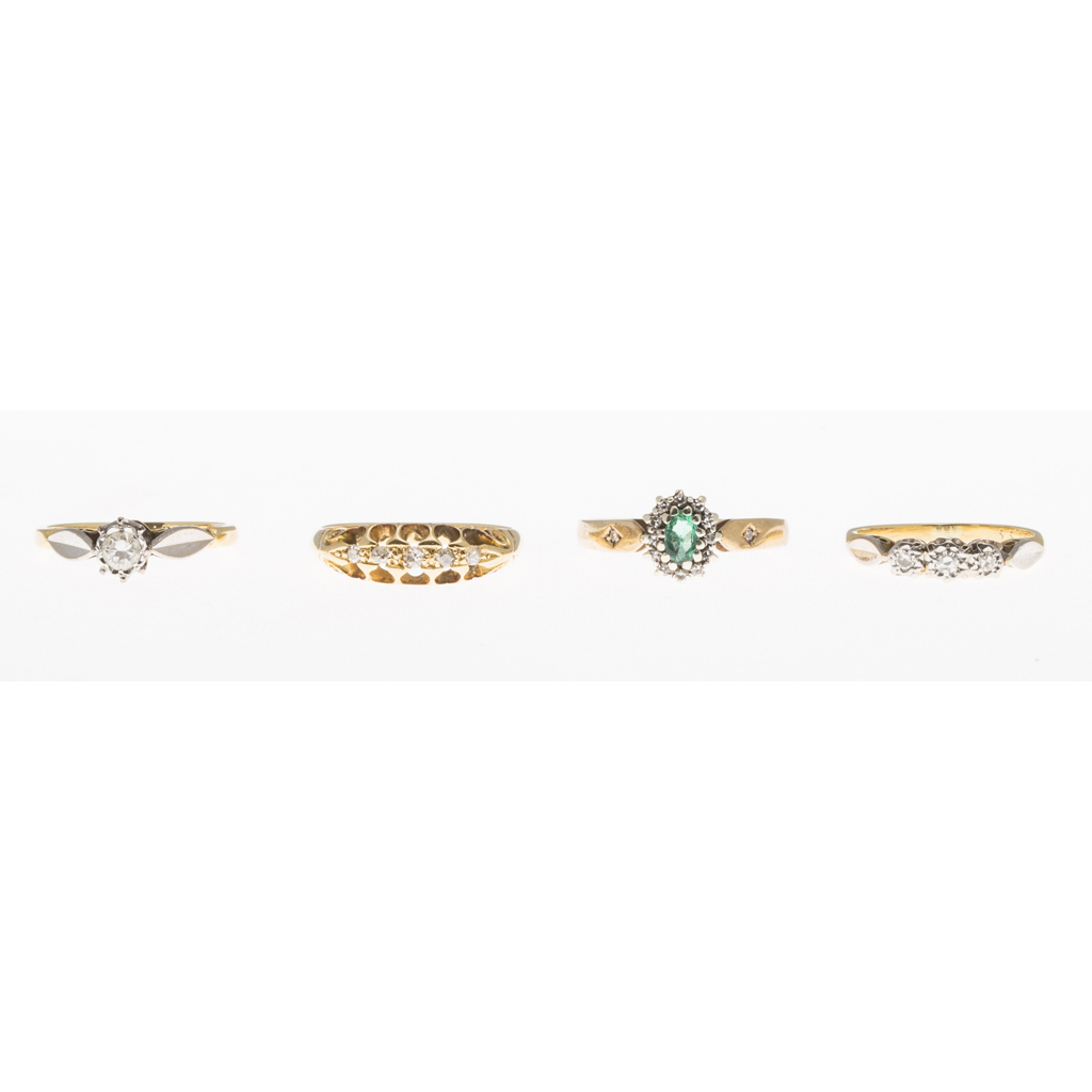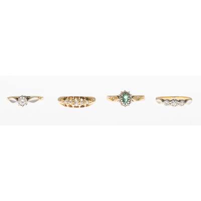 to include an 18ct gold five stone diamond set ring; an illusion set three stone diamond set ring, stamped 9ct; an 18ct gold single stone diamond set ring and an emerald and diamond set ring, stamped 375 (4)