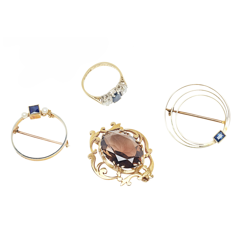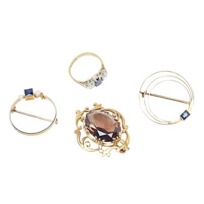 to include an 18ct gold sapphire and diamond set three stone ring, a circular sapphire set brooch, another similar set with a sapphire and seed pearls; a 9ct gold smokey quartz set brooch (4)