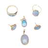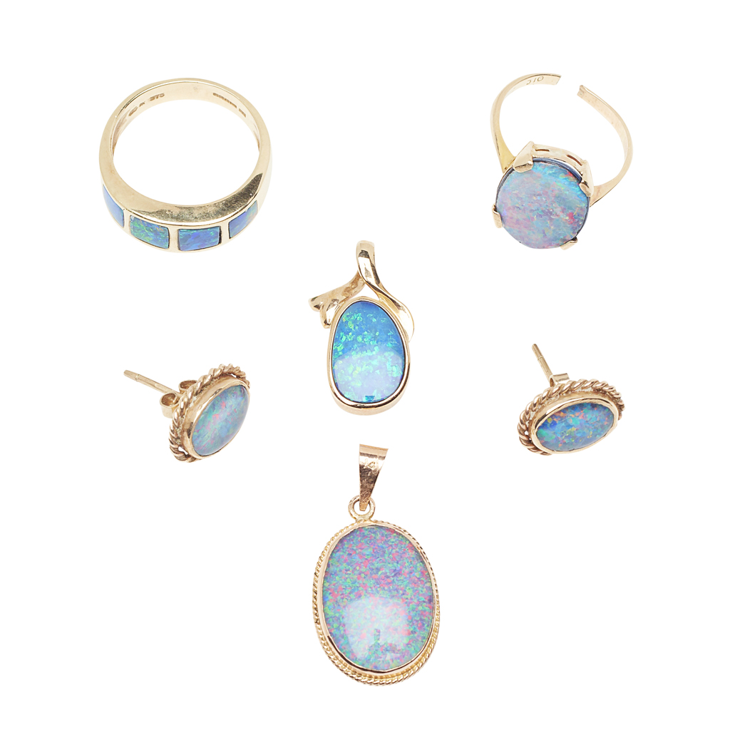 to include an opal doublet set ring, a contemporary 9ct gold opal set ring, a 9ct gold opal set pendant; together with a synthetic opal set pendant and earrings (5)