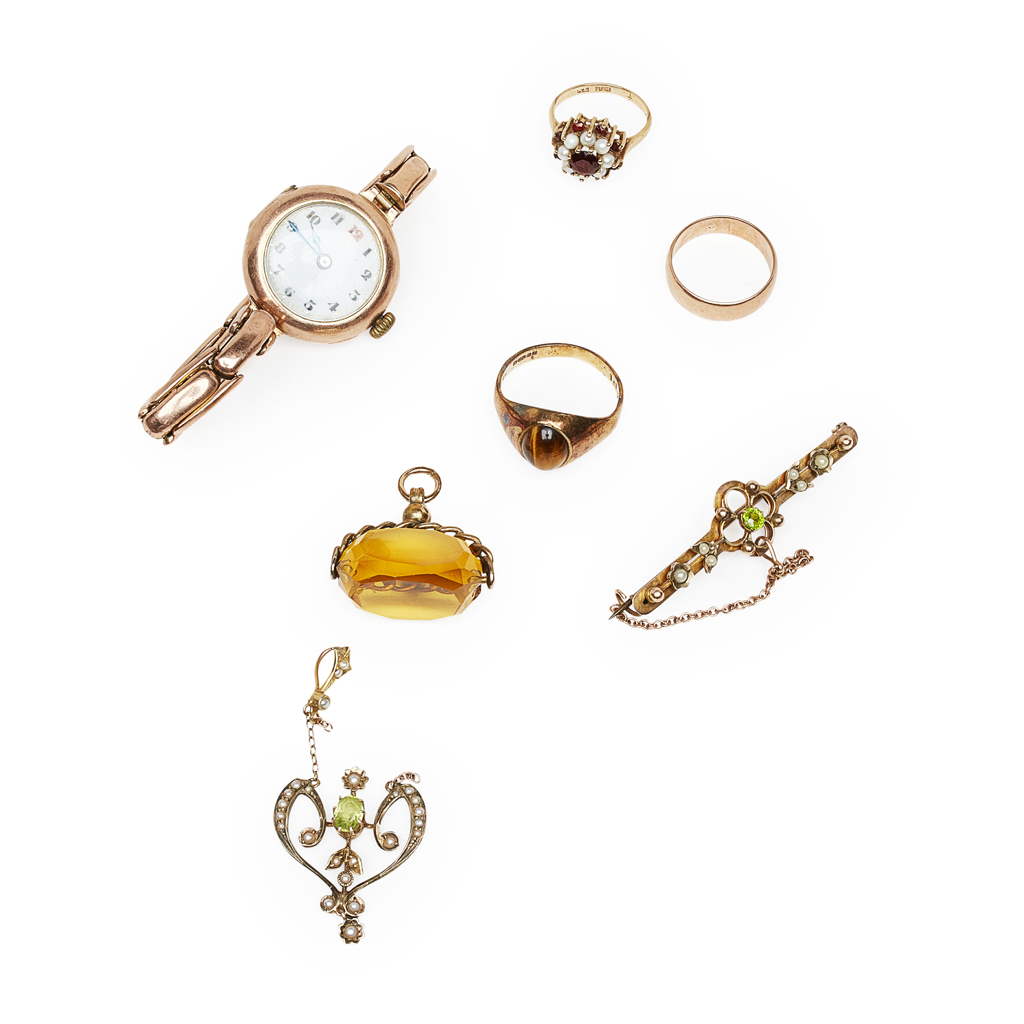to include a 9ct gold tigers eye set ring, a 9ct gold garnet and pearl set cluster ring; a peridot and seed pearl set bar brooch, unmarked; a peridot and seed pearl set pendant, stamped 9ct; a plain wedding band, stamped 9ct; a lady's wrist watch and a citrine set fob (7)