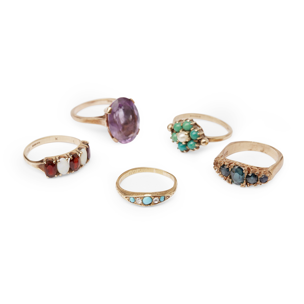 to include a 9ct gold amethyst set ring, a 9ct gold opal and garnet set ring; a 9ct gold turquoise and pearl set ring, a diamond and turquoise set ring, unmarked, and a green tourmaline set ring, stamped 9ct (5)