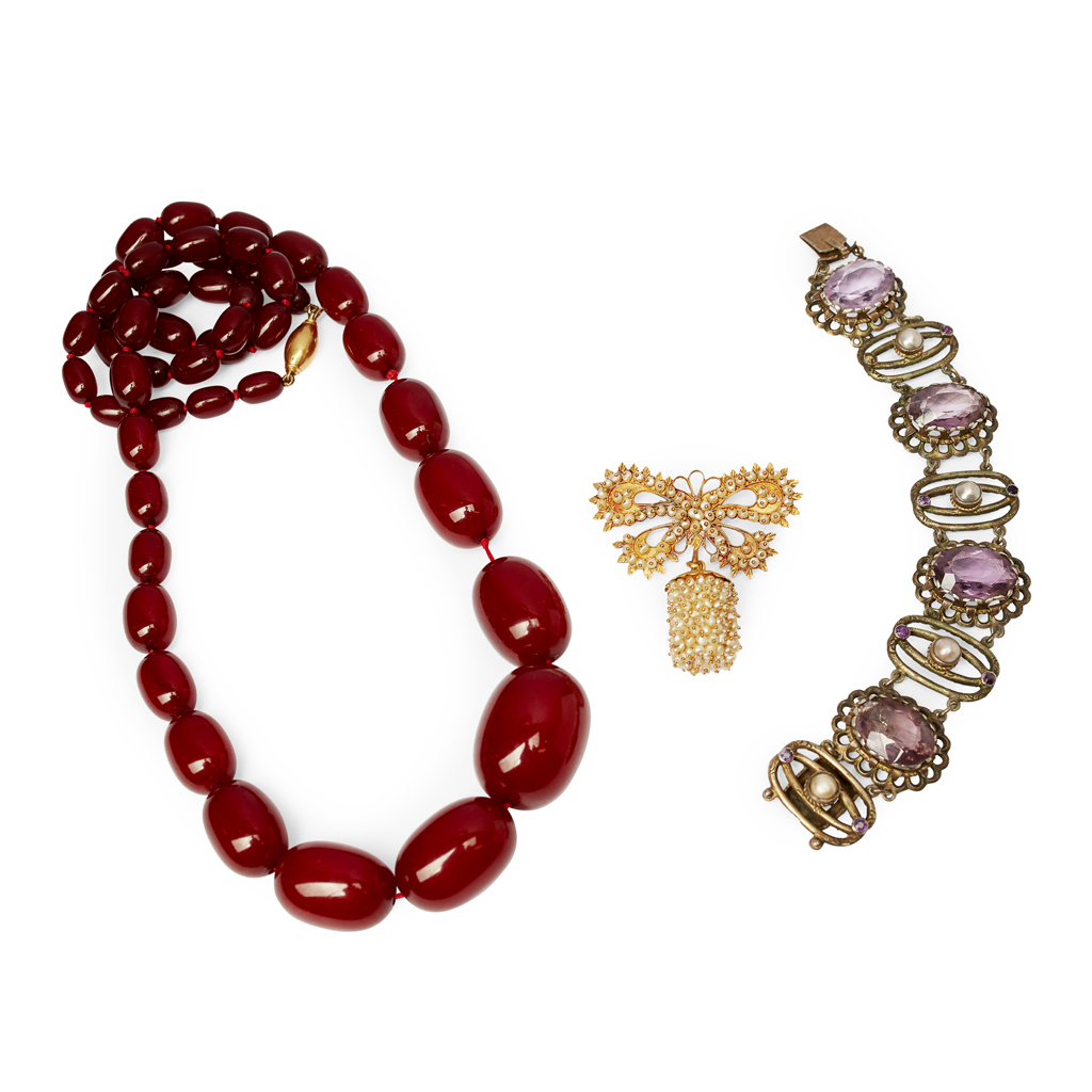 to include a silver amethyst and pearl set bracelet, stamped 800; a seed pearl set bow brooch with pendant drop, stamped 750; an imitation amber bead necklace (3)
