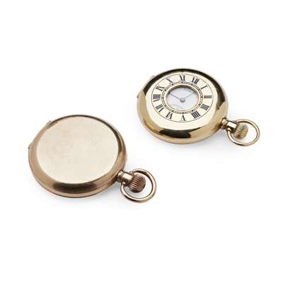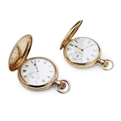 plain lever movement, keyless wind, enamel dial, inscribed and with Roman numerals, subsidiary seconds dial, together with a rolled gold hunter cased pocket watch, plain lever movement (2)